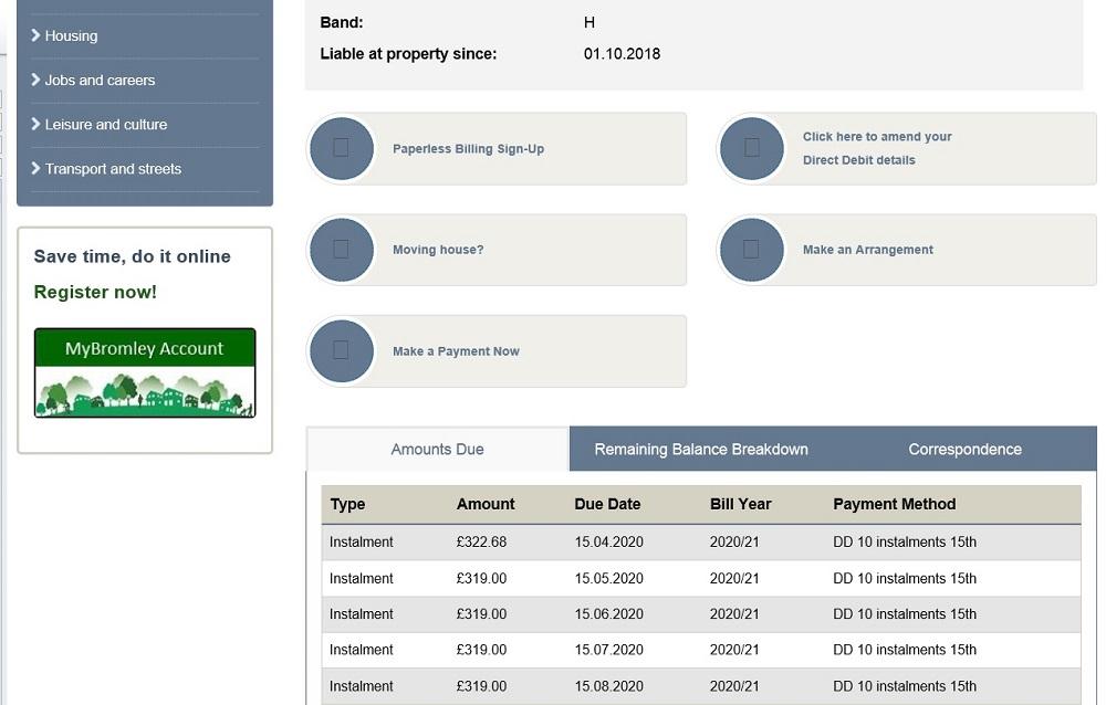 The next screen shows you your council tax account summary – if you have more than one linked, you can switch between them using the drop down menu, where it shows the address of the property.